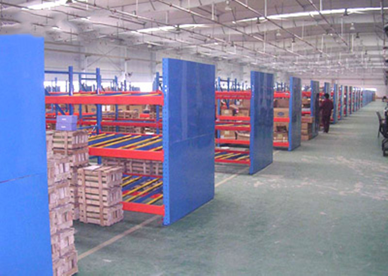 4、横梁与立柱片挂接组装成框架,最后铺设钢层板,至此一组完整的中型货架成型。